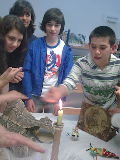 Ora aqui ficam duas imagens que dão muito do ambiente vivido ontem em Valença com "O museu das Palavras". Brincadeira na Biblioteca Pública, com tempo para escrever histórias sugeridas pelos objectos expostos na sala infanto-juvenil e folhear as novidades da colecção. Depois a surpresa: o Thomas Bakk apareceu na sessão e brindou-nos com um dos seus contos! O "pessoal" gostou...